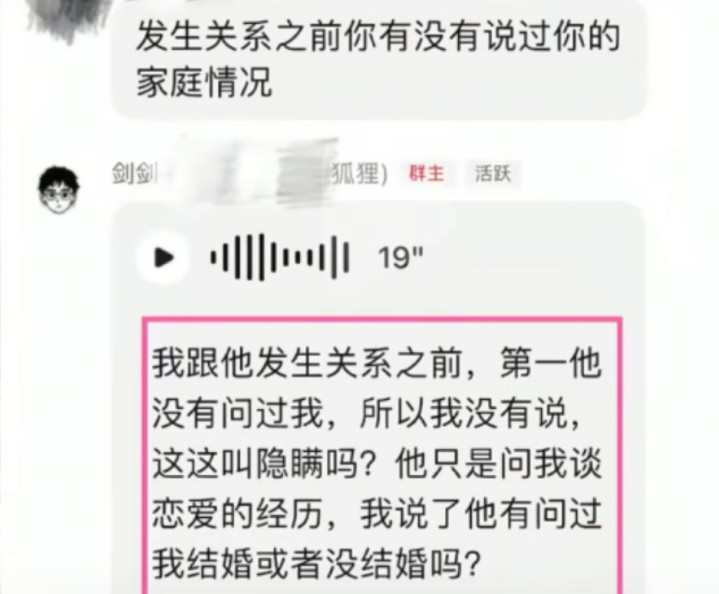 “蓝狐狸”扮演者则在粉丝群回应此事称,未强迫对方,事发前女方只问了自己的恋爱经历,没有询问婚姻情况。“没有问过我,所以我没说,这叫隐瞒吗?”